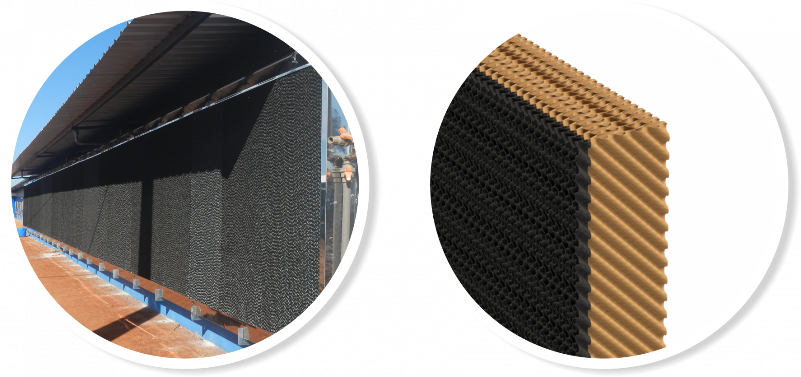 • Placas evaporativas fabricadas com celulose especial de alta durabilidade em uma disposição de favo que maximiza a evaporação da água, reduzindo a temperatura e aumentando a umidade relativa na entrada de ar do ambiente, gerando uma maior eficiência de resfriamento e menor perda de carga do sistema como um todo;